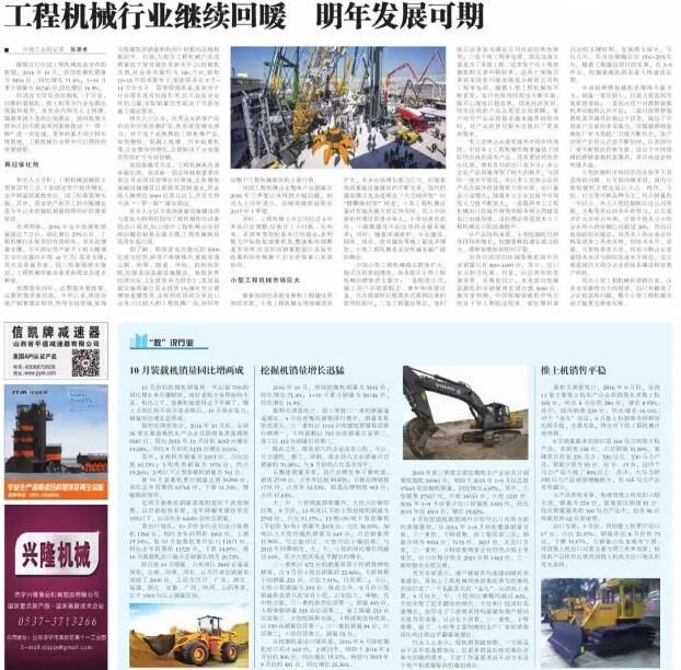 我國工程機械企業(yè)整體產(chǎn)品銷量在2016年三季度以來得到大幅回暖,相關人士分析表示,回暖將繼續(xù)延續(xù)至2017年1季度。