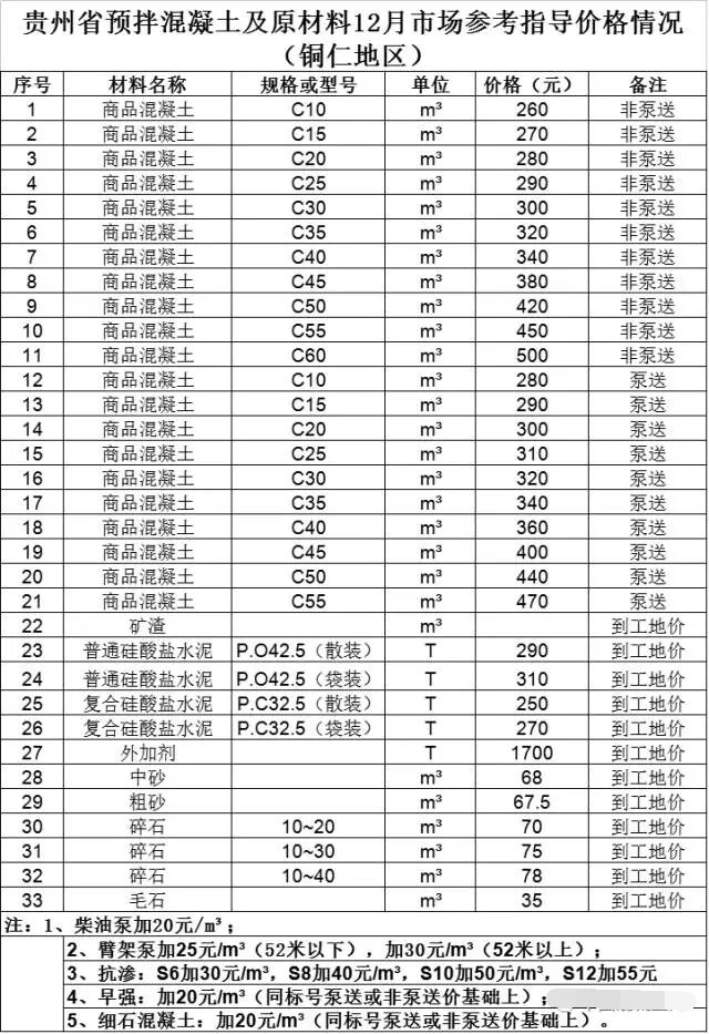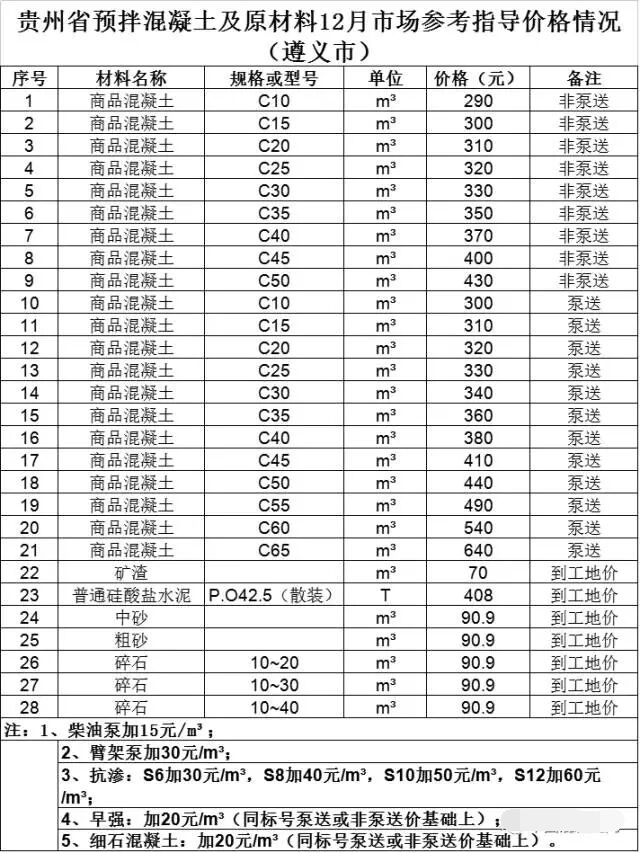 【行情數(shù)據(jù)】貴州省預(yù)拌混凝土及原材料12月市場(chǎng)參考指導(dǎo)價(jià)格情況