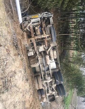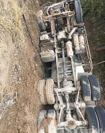 記者趕到現場從很遠地方就可以看到一輛攪拌車橫躺在渠中,零部件散落一地,攪拌車有不同程度的受損。