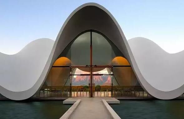整個教堂就是一片被“軟化”的混凝土片,飄浮著嵌在四片玻璃上。這片混凝土通過優(yōu)雅地起伏完成自我支撐,同時營造出一個完整獨立的空間。十字架與窗框結(jié)合,完整且恰到好處。四周的景色在起伏的屋頂曲線的“剪切”下呈現(xiàn)出對稱、均衡的完美構(gòu)圖。