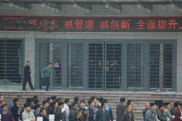3月8日凌晨,袖纏紅護(hù)身符布條、手戴白手套,600多人拿著棍棒聚集在濟(jì)南104國道山東山水水泥集團(tuán)有限公司總部門口,強(qiáng)行沖進(jìn)大門,對辦公樓的幾個門進(jìn)行“砸打”,還從廠區(qū)強(qiáng)行把裝載機(jī)開上辦公樓門口回廊對辦公樓大門進(jìn)行蠻擊。此時,集團(tuán)辦公樓里山水高管和員工只有20余人,多人在防衛(wèi)中被外邊投擲的石塊砸中受重傷,躺在醫(yī)院。