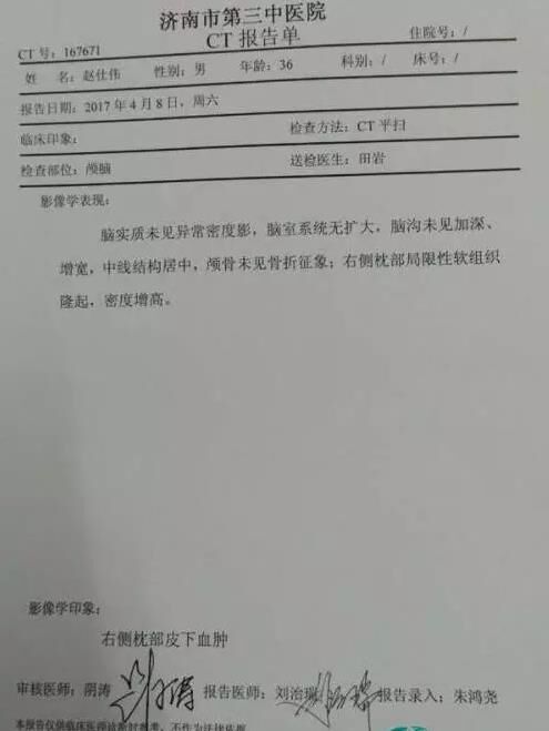 濟(jì)南市第三中醫(yī)院CT報告單顯示,趙先生右側(cè)枕部局限性軟組織隆起,密度增高。趙先生的同事周先生對記者說:“看著朋友被打成這樣,我心里很過意不去,所以我現(xiàn)在到醫(yī)院照顧他。”