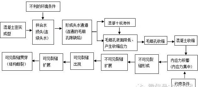 作者在攪拌站成立之初的抗裂實(shí)踐中,對這些現(xiàn)象也深感困惑。直到后來明確了早期裂縫是因?yàn)榛炷潦^多所致,并對這一機(jī)理進(jìn)行了深入研究,才重新認(rèn)識了混凝土收縮裂縫形成的全過程,如圖1[5]所示。