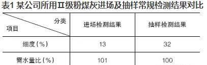 優(yōu)質(zhì)的粉煤灰摻入混凝土可明顯地改善混凝土的和易性,當(dāng)粉煤灰摻量大于膠材總量的5%~10%時(shí),效果極為明顯?,F(xiàn)今在混凝土實(shí)際生產(chǎn)中,粉煤灰摻量往往達(dá)到20%,有的甚至高達(dá)30%,但混凝土的和易性卻不盡人意。抽取原材料進(jìn)行檢測時(shí),發(fā)現(xiàn)粉煤灰的檢測結(jié)果經(jīng)常不滿足標(biāo)準(zhǔn)要求或者與驗(yàn)收時(shí)的結(jié)果相差甚遠(yuǎn)?,F(xiàn)以某公司所用Ⅱ級粉煤灰進(jìn)場及抽樣常規(guī)檢測結(jié)果進(jìn)行對比,見表1。