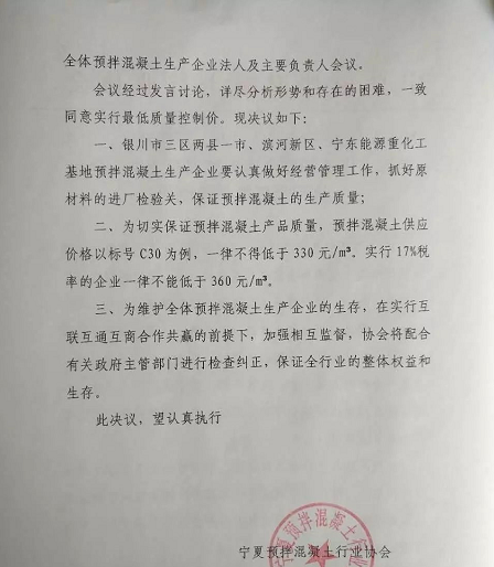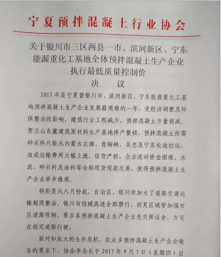面對如此大的生存危機(jī),寧夏混凝土協(xié)會于9月7日召開了銀川市三區(qū)兩縣一市、濱河新區(qū)、寧東能源重化工基地全體預(yù)拌混凝土生產(chǎn)企業(yè)法人及主要負(fù)責(zé)人會議。會議一致同意實(shí)行最低質(zhì)量控制價(jià)。預(yù)拌混凝土供應(yīng)價(jià)格以標(biāo)號C30為例,一律不得低于330元/方,實(shí)行17%稅率的企業(yè)一律不能低于360元/方,以切實(shí)保證當(dāng)?shù)仡A(yù)拌混凝土質(zhì)量。