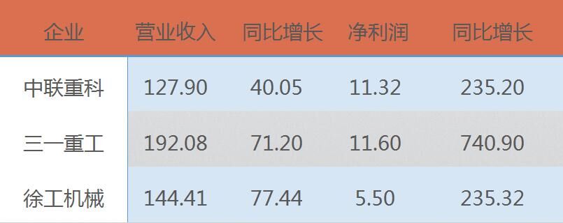 混凝土機(jī)械市場(chǎng)復(fù)蘇程度決定未來(lái)生產(chǎn)企業(yè)利潤(rùn)回復(fù)的彈性高度,混凝土機(jī)械的回暖,有利改善行業(yè)企業(yè)毛利率水平。中聯(lián)重科、三一重工、徐州股份三家上市公司上半年年報(bào)數(shù)據(jù)喜人。