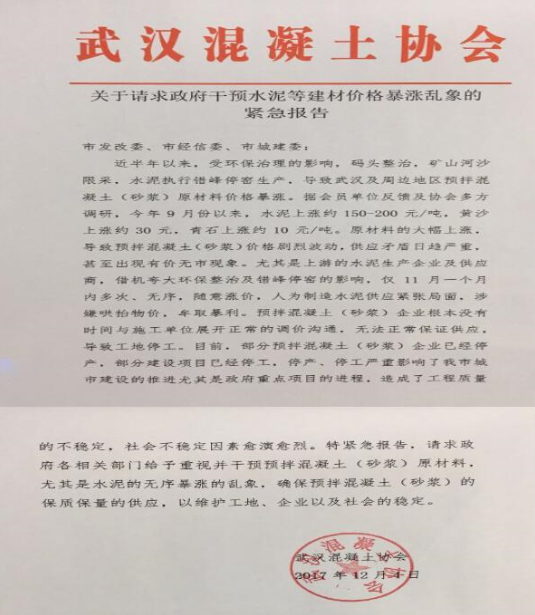 武漢混凝土協(xié)會(huì)網(wǎng)站4日發(fā)布《關(guān)于請求政府干預(yù)水泥等建材價(jià)格暴漲亂象的緊急報(bào)告》,《報(bào)告》表示,上游的水泥生產(chǎn)企業(yè)及供應(yīng)商借機(jī)夸大環(huán)保整治及錯(cuò)峰停窯的影響,僅11月有一個(gè)月內(nèi)多次、無序,隨意漲價(jià),人為制造水泥供應(yīng)緊張局面,涉嫌哄抬物價(jià),牟取暴利。因?yàn)閮r(jià)格原因無法正常保證混凝土(砂漿)的正常供應(yīng),部分建設(shè)項(xiàng)目已經(jīng)停工。
