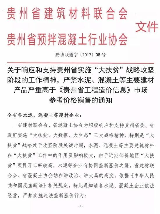 12月5日,貴州省建筑材料聯(lián)合會(huì)和貴州省預(yù)拌混凝土行業(yè)協(xié)會(huì)聯(lián)合發(fā)文《關(guān)于響應(yīng)和支持貴州省實(shí)施“大扶貧”戰(zhàn)略攻堅(jiān)階段的工作精神,嚴(yán)禁水泥、混凝土等主要建材產(chǎn)品嚴(yán)重高于<貴州省工程造價(jià)信息>市場參考價(jià)格銷售的通知》(黔協(xié)聯(lián)通字〔2017〕08號(hào))(下文稱為《通知》)。