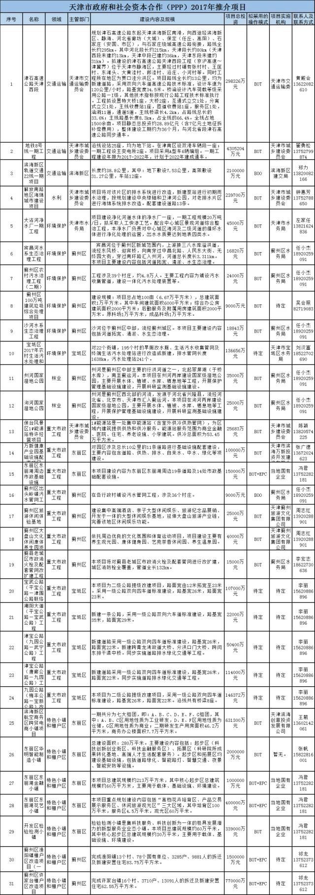 天津市發(fā)改委推介31個(gè)PPP項(xiàng)目,總投資1469億元,涉及交通運(yùn)輸、水利、環(huán)境保護(hù)、林業(yè)、重大市政工程和特色小鎮(zhèn)及棚戶區(qū)六個(gè)領(lǐng)域,其中與基建相關(guān)的23個(gè),投資超1438億元。