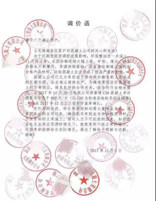 12月中旬長沙地區(qū)混凝土企業(yè)向合作施工單位發(fā)布的調(diào)價(jià)函