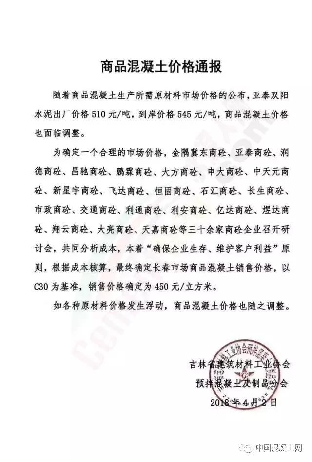 為確定一個(gè)合理的市場(chǎng)價(jià)格,金隅冀東商砼、亞泰商砼、潤德商砼、昌馳商砼、鵬霖商砼、大方商砼、中天元商砼、新星宇商砼、飛達(dá)商砼、石匯商砼、長生商砼、市政商砼、交通商砼、利通商砼、利安商砼、億達(dá)商砼、煜達(dá)商砼、翔云商砼、大亮商砼、天嘉商砼等三十余家商砼企業(yè)召開研討會(huì),共同分析,本著“確保企業(yè)生存、維護(hù)客戶利益”原則,根據(jù)成本核算,最終確定長春市場(chǎng)商品混凝土銷售價(jià)格,以C30為基準(zhǔn),銷售價(jià)格確定為450元/立方米。