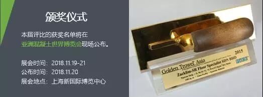 其中,亞洲金鏝刀獎報(bào)名已于2018年9月30日截止、已在緊張?jiān)u選中,并將于2018年11月20日在上海新國際博覽中心舉辦的亞洲混凝土世界博覽會上隆重公布獲獎名單并舉行頒獎儀式;獲獎?wù)哌€將受邀參加于2019年1月22-25日期間在美國拉斯維加斯會展中心舉辦的美國混凝土世界博覽會。
