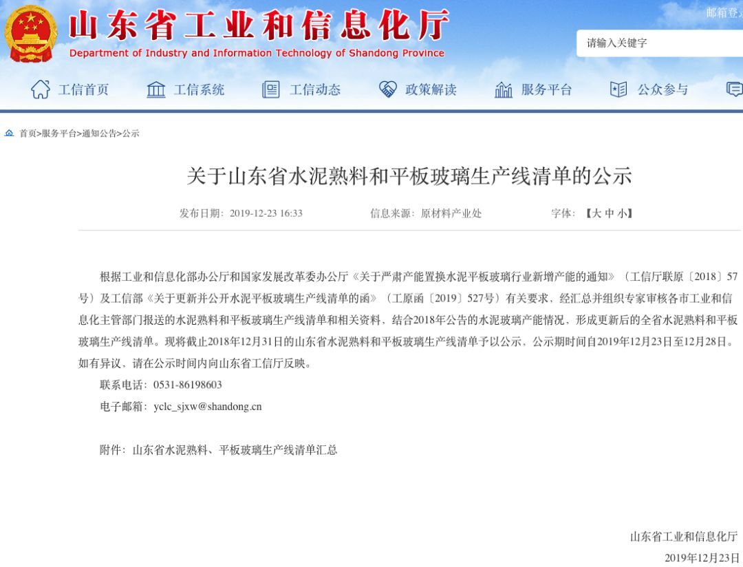 12月23日,山東省工信廳發(fā)布《關于山東省水泥熟料和平板玻璃生產線清單的公示》,經匯總并組織專家審核各市工業(yè)和信息化主管部門報送的水泥熟料和平板玻璃生產線清單和相關資料,結合2018年公告的水泥玻璃產能情況,形成更新后的全省水泥熟料和平板玻璃生產線清單。