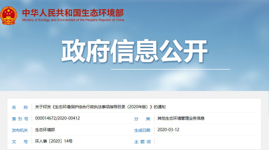 近日,生態(tài)環(huán)境部發(fā)布了關于印發(fā)《生態(tài)環(huán)境保護綜合行政執(zhí)法事項指導目錄(2020年版)》(以下簡稱“《指導目錄》”)的通知,稱根據(jù)深化黨和國家機構改革有關安排部署,為貫徹落實《國務院辦公廳關于生態(tài)環(huán)境保護綜合行政執(zhí)法有關事項的通知》(國辦函〔2020〕18號)要求,扎實推進生態(tài)環(huán)境保護綜合行政執(zhí)法改革,現(xiàn)印發(fā)《生態(tài)環(huán)境保護綜合行政執(zhí)法事項指導目錄(2020年版)》及說明。