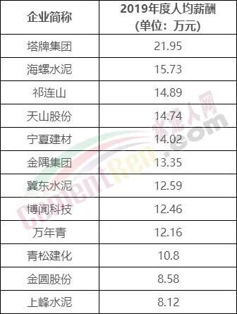 水泥行業(yè)上市企業(yè)員工薪酬排行榜