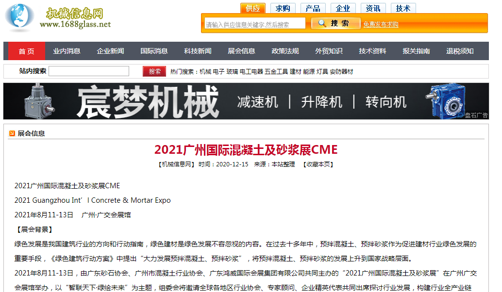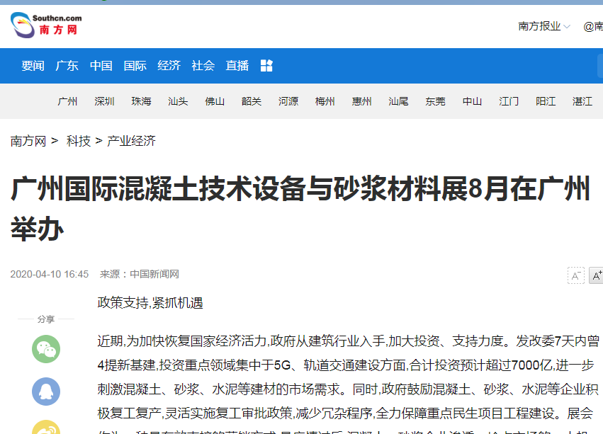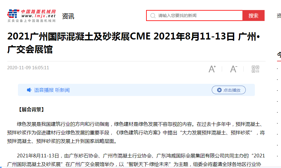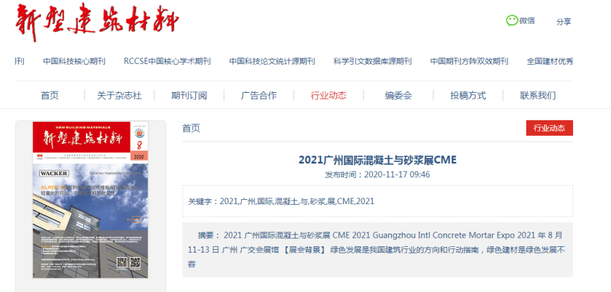 廣州國際混凝土及砂漿展已于2020年成功舉辦,自項目立項以來,得到多方媒體的關(guān)注和報道。據(jù)統(tǒng)計,2020-2021年度,騰訊視頻、愛奇藝、土豆網(wǎng)、優(yōu)酷視頻等電視媒體,網(wǎng)易房產(chǎn)、新浪家居、廣州搜狐焦點(diǎn)、騰訊網(wǎng)、中國數(shù)字經(jīng)濟(jì)網(wǎng)、央廣網(wǎng)、360慧聰網(wǎng)、南方網(wǎng)、北方網(wǎng)、羊城晚報、廣州日報、新浪網(wǎng)、新京報、21世紀(jì)經(jīng)濟(jì)報道、東方網(wǎng)、光明網(wǎng)、中國商業(yè)新聞網(wǎng)、焦點(diǎn)中國網(wǎng)等主流媒體,抖音、快手、西瓜視頻、今日頭條、百家號、火山小視頻等視頻媒體和廣東建設(shè)報、中國路面機(jī)械網(wǎng)、新型砂漿網(wǎng)、世界機(jī)械網(wǎng)、工程機(jī)械在線、攪拌設(shè)備網(wǎng)、中國保溫砂漿網(wǎng)等行業(yè)媒體,以及《混凝土雜志》、《砼時代》等雜志媒體均對展會給予高度關(guān)注,積極宣傳展會動態(tài)與資訊。感謝各行業(yè)媒體、主流媒體、視頻媒體、雜志的大力支持與高度認(rèn)可。