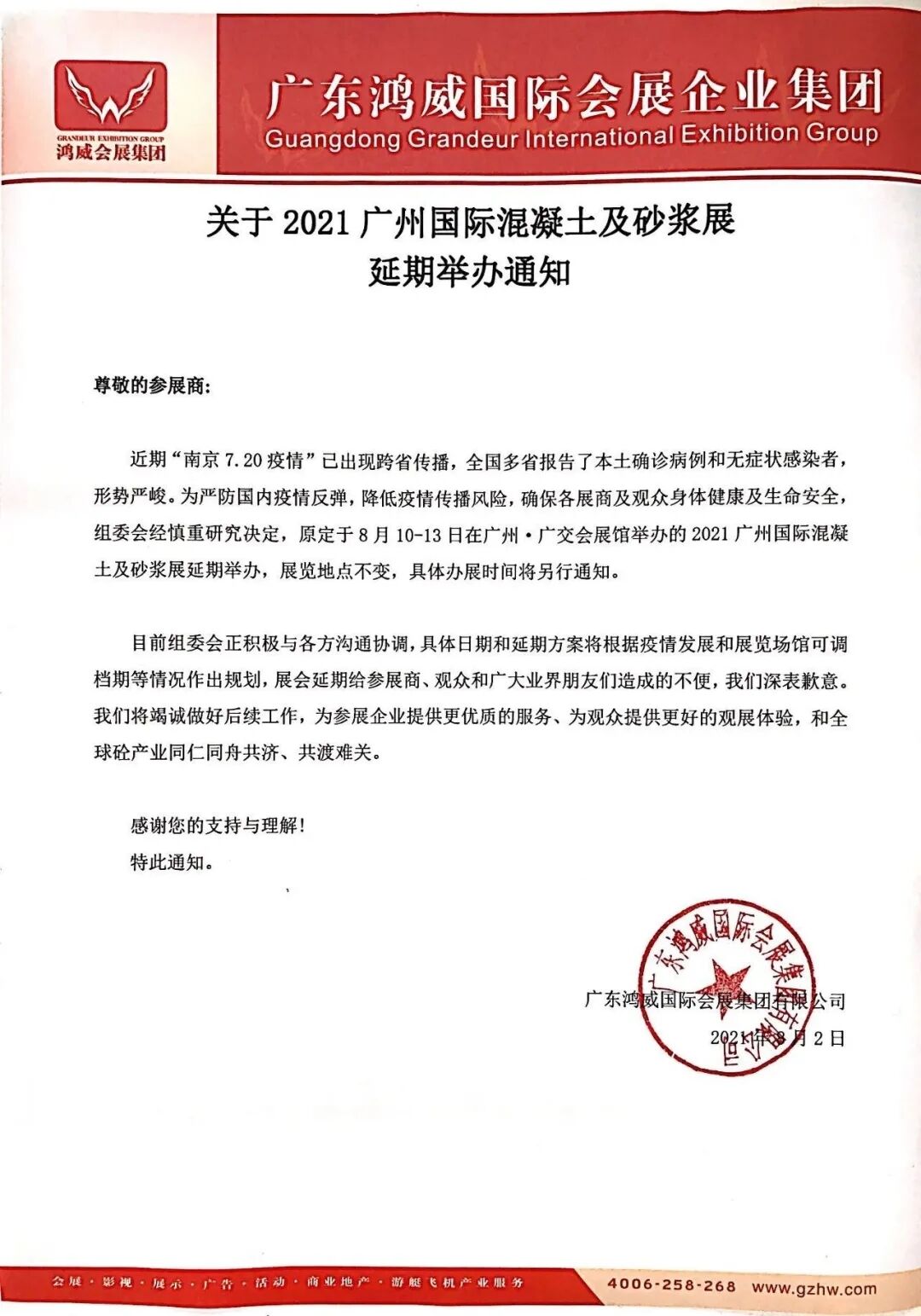 由于當(dāng)前國內(nèi)多地出現(xiàn)新型冠狀病毒肺炎新增確診病例、中高風(fēng)險(xiǎn)地區(qū)不斷增加的疫情嚴(yán)峻形勢影響,為全力配合做好疫情防控工作,避免大規(guī)模聚集和降低疫情傳播風(fēng)險(xiǎn),保障參展商、觀眾及工作人員健康安全,維護(hù)參展單位權(quán)益,確保展會效果,組委會經(jīng)慎重研究決定,原定于8月10-13日在廣州·廣交會展館舉辦的2021廣州國際混凝土及砂漿展延期舉辦,展覽地點(diǎn)不變,具體辦展時間將另行通知。