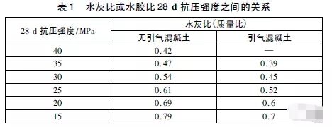 當(dāng)無試驗(yàn)資料可用時,對于含有Type1波特蘭水泥(硅酸鹽水泥)的混凝土,可以在表1中得到近似和相對固定的數(shù)據(jù)。用有代表性的材料,在試驗(yàn)室標(biāo)準(zhǔn)養(yǎng)護(hù)條件下試驗(yàn)28d的試塊,表1中的水膠比可以得到與之對應(yīng)的強(qiáng)度。