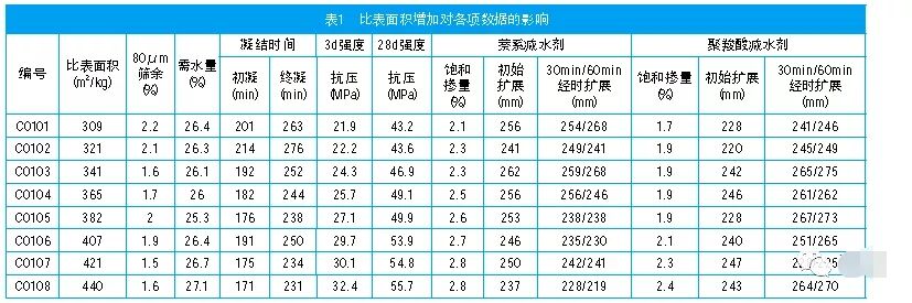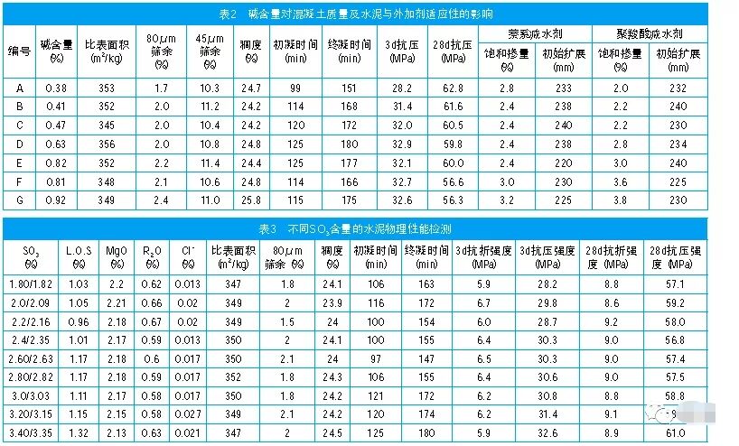 在水泥熟料礦物當中,C3A的水化速度是最快的,它在水化作用時,能離解出Al3+,使水化物形成的膠體溶液發(fā)生凝聚。當加入石膏以后,可以和C3A很快化合,生成硫鋁酸鈣晶體,使凝結(jié)時間延緩。在石膏摻量過高時,C3A電離出的Al3+雖然很快消失,但是硫酸鈣電離出來的Ca2+又起凝結(jié)作用,同樣產(chǎn)生促凝作用,生成硫鋁酸鈣,產(chǎn)生體積膨脹,會使已硬化的水泥石強度降低,甚至使構(gòu)件開裂。因此,在粉磨水泥時要控制石膏的摻加量。從表3可知,水泥中SO3含量從1.8%~2.8%范圍內(nèi),凝結(jié)時間未體現(xiàn)規(guī)律性變化,在3.0%~3.4%,凝結(jié)時間有一定延長,但總體幅度不大,約10min~20min。隨著SO3含量的增加,3d及28d強度總體略呈增加趨勢,但幅度較小。從混凝土適應(yīng)性試驗分析中得出:使用萘系減水劑時,隨著SO3含量的不斷增加,減水劑的飽和摻量變化不明顯,初始擴展度變化不大,經(jīng)時損失率總體變小。使用聚羧酸系減水劑時,隨著SO3含量的不斷增加,減水劑的飽和摻量整體呈現(xiàn)下降趨勢,在同一摻量下,凈漿呈現(xiàn)初始擴展趨小變化,經(jīng)時均出現(xiàn)返大現(xiàn)象。綜合考慮水泥強度、凝結(jié)時間及水泥及減水劑的適應(yīng)性:水泥中SO3含量可控制在2.2%~2.8%之間。除上述水泥比表面積、R2O、SO3對混凝土質(zhì)量有直接影響外,其它品質(zhì)指標對混凝土質(zhì)量也有影響:水泥需水量易引起混凝土強度變化,影響混凝土耐久性、和易性;水泥強度波動過大,則容易造成混凝土強度不合格;水泥粉磨工藝和顆粒分布等對混凝土質(zhì)量也有明顯影響。從混凝土使用角度,需進一步實驗和研究,控制好水泥質(zhì)量。