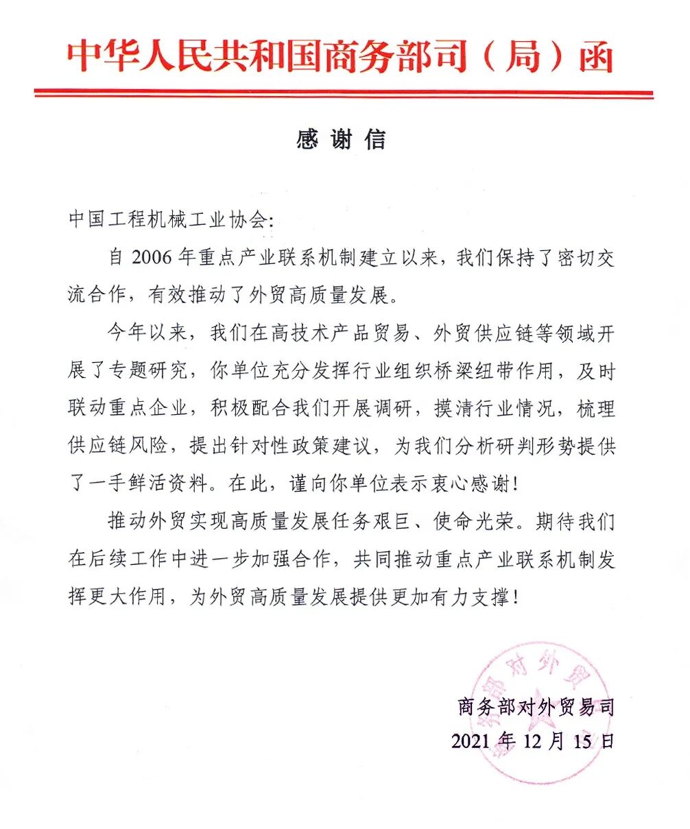 近日,商務(wù)部對(duì)外貿(mào)易司致函中國(guó)工程機(jī)械工業(yè)協(xié)會(huì),就協(xié)會(huì)今年以來(lái),積極配合商務(wù)部對(duì)外貿(mào)易司在高技術(shù)產(chǎn)品貿(mào)易、外貿(mào)供應(yīng)鏈等領(lǐng)域開展了專題研究,收集、整理了大量的行業(yè)外貿(mào)進(jìn)出口情況,受到了高度的肯定。并指出,協(xié)會(huì)充分發(fā)揮行業(yè)組織橋梁紐帶作用,及時(shí)聯(lián)動(dòng)重點(diǎn)企業(yè),積極配合商務(wù)部對(duì)外貿(mào)易司開展調(diào)研,摸清行業(yè)情況,梳理供應(yīng)鏈風(fēng)險(xiǎn),提出針對(duì)性政策建議,為商務(wù)部對(duì)外貿(mào)易司分析研判形勢(shì)提供了一手鮮活資料。在此,謹(jǐn)向協(xié)會(huì)表示衷心感謝!