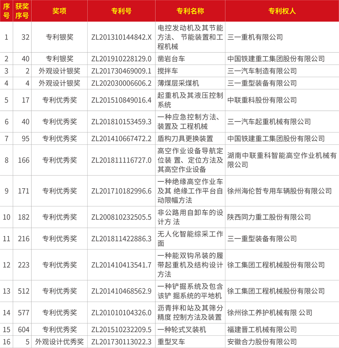 本屆評選活動(dòng)中,中國工程機(jī)械行業(yè)共有十六項(xiàng)專利榮獲“中國專利獎(jiǎng)”,其中兩項(xiàng)獲專利銀獎(jiǎng),兩項(xiàng)獲外觀設(shè)計(jì)銀獎(jiǎng),十一項(xiàng)獲專利優(yōu)秀獎(jiǎng),一項(xiàng)獲外觀設(shè)計(jì)優(yōu)秀獎(jiǎng)。