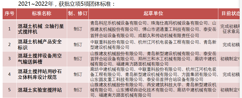 2022年召開(kāi)第五屆中國(guó)工程機(jī)械工業(yè)協(xié)會(huì)標(biāo)準(zhǔn)化專家委員會(huì)(混凝土機(jī)械)全體會(huì)議,加強(qiáng)和促進(jìn)與會(huì)單位流,充分發(fā)揮專家委員作用,共同堆進(jìn)團(tuán)體標(biāo)準(zhǔn)發(fā)展。