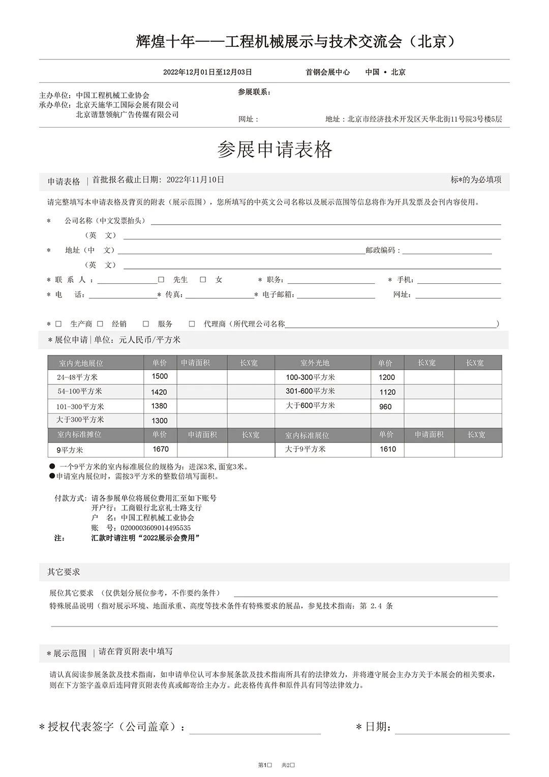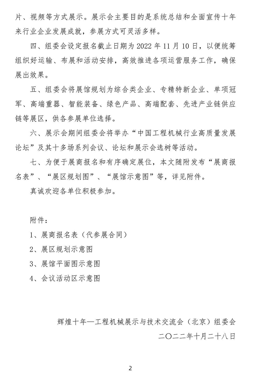 自協(xié)會(huì)發(fā)布舉辦“輝煌十年——工程機(jī)械展示與技術(shù)交流會(huì)(北京)”(以下簡(jiǎn)稱“展示會(huì)”)通知后,得到了各參展單位的快速響應(yīng)和積極支持,有的已經(jīng)報(bào)名大面積參展,有的正在履行審批程序或來電表示參加展出,組委會(huì)深表衷心感謝!為及時(shí)傳遞展會(huì)信息,服務(wù)好廣大展商,辦好本次展示會(huì),現(xiàn)向廣大展商正式發(fā)出邀請(qǐng),并將有關(guān)展示會(huì)方案說明如下:一、為充分展示黨的十八大以來工程機(jī)械行業(yè)各領(lǐng)域取得的發(fā)展成就,協(xié)會(huì)研究決定召開本次展示會(huì),邀請(qǐng)廣大協(xié)會(huì)會(huì)員和產(chǎn)業(yè)鏈上下游企業(yè)參展,共同分享企業(yè)發(fā)展成就和謀劃行業(yè)美好未來。二、展示會(huì)于2022年12月1日至3日在北京冬奧會(huì)滑雪大跳臺(tái)項(xiàng)目舉辦地——北京首鋼會(huì)展中心舉辦。屆時(shí)協(xié)會(huì)將邀請(qǐng)政府部門、相關(guān)用戶、媒體朋友和廣大觀眾到展示會(huì)現(xiàn)場(chǎng)參觀交流。12月3日(周六)實(shí)施社會(huì)公眾開放日,讓社會(huì)觀眾充分體驗(yàn)工程機(jī)械發(fā)展魅力。三、北京首鋼會(huì)展中心適合舉辦室內(nèi)高品質(zhì)展示會(huì),室外面積有限,而且適合承重較輕的產(chǎn)品展出。組委會(huì)初步規(guī)劃總展出面積2萬(wàn)平米左右,希望各參展企業(yè)提供產(chǎn)業(yè)鏈上下游的先進(jìn)技術(shù)產(chǎn)品和高端裝備進(jìn)行展出,大型設(shè)備和示范工程應(yīng)用等可通過模型、圖片、視頻等方式展示。展示會(huì)主要目的是系統(tǒng)總結(jié)和全面宣傳十年來行業(yè)企業(yè)發(fā)展成就,參展方式可靈活多樣。四、組委會(huì)設(shè)定報(bào)名截止日期為2022年11月10日,以便統(tǒng)籌組織好運(yùn)輸、布展和活動(dòng)安排,高效推進(jìn)各項(xiàng)運(yùn)營(yíng)服務(wù)工作,確保展出效果。五、組委會(huì)將展館規(guī)劃為綜合類企業(yè)、專精特新企業(yè)、單項(xiàng)冠軍、高端重器、智能裝備、綠色產(chǎn)品、高端配套、先進(jìn)產(chǎn)業(yè)鏈供應(yīng)鏈等展區(qū),供各參展單位選擇。六、展示會(huì)期間組委會(huì)將舉辦“中國(guó)工程機(jī)械行業(yè)高質(zhì)量發(fā)展論壇”及其十多場(chǎng)系列會(huì)議、論壇和展示會(huì)選樹等活動(dòng)。七、為便于展商報(bào)名和有序確定展位,本文隨附發(fā)布“展商報(bào)名表”、“展區(qū)規(guī)劃圖”、“展館示意圖”等,詳見附件。4、會(huì)議活動(dòng)區(qū)示意圖