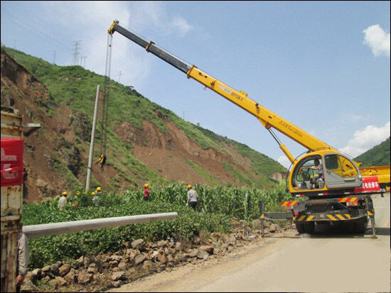 筆者連線徐工起重機事業(yè)部駐云南辦事處卞泳主任,他介紹了相關(guān)情況。8月7日上午,魯?shù)榭h城通往震中龍頭山鎮(zhèn)的道路經(jīng)過兩日的搶修和交通管制已基本暢通,武警交通部隊決定允許放行小型汽車起重機。指揮部要求南方電網(wǎng)公司迅速完成龍頭山鎮(zhèn)幾處電線桿及變壓設(shè)備的安裝。南方電網(wǎng)公司考慮道路情況惡劣,決定征用一直等候在交通管制境界線之外的一臺徐工QY12B.5汽車起重機,徐工12噸起重機迅速到達現(xiàn)場投入搶修。