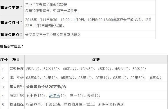 泵車拍賣會(huì)第2場(chǎng)將于2015年1月11日在湖南長(zhǎng)沙三一工業(yè)城舉行。