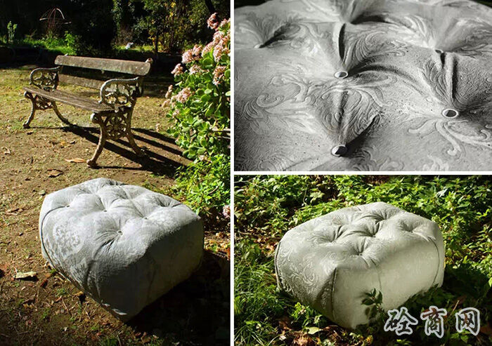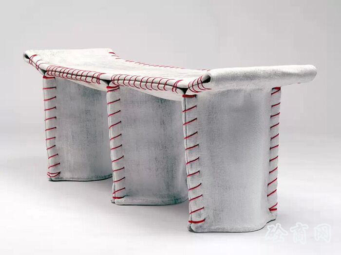 德國設計師florian schmid設計了一種“縫合混凝土”座椅,這個設計受到了混凝土帆布(CC)材料的影響?;炷敛剂鲜且环N浸漬了布料的柔軟水泥,它在水合過程中變硬,最終形成一個輕薄的,防水防火的混凝土表皮,將柔軟溫暖的布料質感和堅硬冰冷的水泥融為一體。
