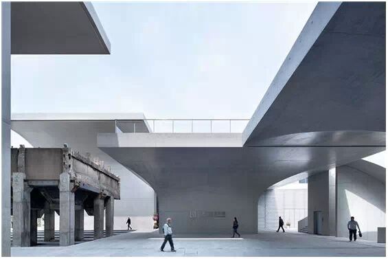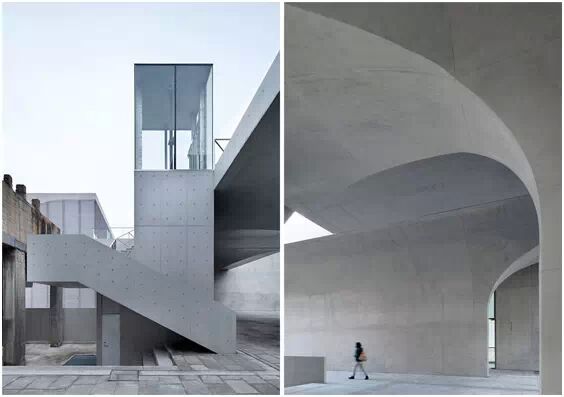 在“傘拱”結(jié)構(gòu)的空腔里,地面以上的“傘拱”覆蓋空間,墻體和天花均為清水混凝土的表面,它們的幾何分界位置也變得模糊。這樣的結(jié)構(gòu)性空間,在形態(tài)上不僅對(duì)人的身體形成庇護(hù)感,亦與保留的江邊碼頭的煤料斗產(chǎn)生視覺呼應(yīng)。建筑的內(nèi)部空間也得以呈現(xiàn)一種原始的野性魅力,而有著大小調(diào)節(jié)的空間尺度以及留有模板拼縫和螺栓孔的清水混凝土表面又會(huì)帶來一種現(xiàn)實(shí)感。這種“直白”式的結(jié)構(gòu)、材料、空間所形成的直接性與樸素性,加上大尺度出挑所產(chǎn)生的力量感或輕盈感,使整個(gè)建筑與原有場(chǎng)地的工業(yè)特質(zhì)間取得一種時(shí)間與空間的接續(xù)關(guān)系。地面以上的清水混凝土“傘拱”下的流動(dòng)展覽空間和地下一層傳統(tǒng)“白盒子”式的展覽空間由一個(gè)呈螺旋回轉(zhuǎn)、層層跌落的階梯空間聯(lián)接,既原始又現(xiàn)實(shí)的空間和古代、近代、現(xiàn)代直到當(dāng)代藝術(shù)的展覽陳列,這種并置的張力,呈現(xiàn)出一種具有時(shí)間性的展覽空間。