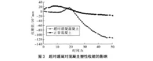 試驗(yàn)以C30混凝土為研究對(duì)象,采用CABR-NES型非接觸式混凝土收縮變形測(cè)定儀,對(duì)比研究超時(shí)緩凝對(duì)混凝土塑性收縮的影響,試驗(yàn)結(jié)果見圖3。