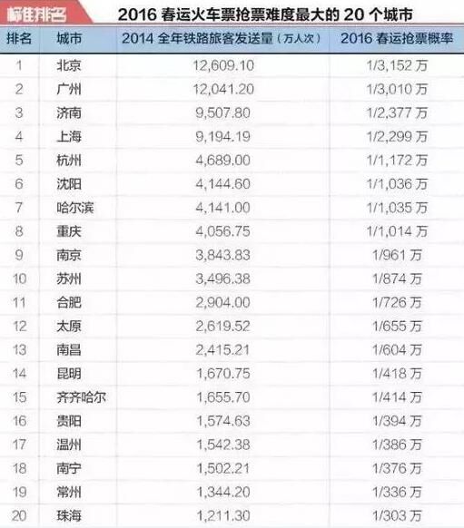 按照以上方法,標(biāo)準(zhǔn)排名在50個(gè)城市的數(shù)據(jù)基礎(chǔ)上,統(tǒng)計(jì)出了“2016春運(yùn)火車票搶票難度最大的20個(gè)城市”。其中,擁有大量外來人口的北京,當(dāng)仁不讓成為了出發(fā)地最難買票的城市;打工圣地廣州,位列第二;濟(jì)南作為人口大省山東的省會,位列第三;上海和杭州緊隨其后,位列第四和第五;沈陽、哈爾濱、重慶、南京、蘇州、合肥、太原、南昌、昆明、齊齊哈爾、貴陽、溫州、南寧、常州和珠海分別進(jìn)入前20強(qiáng),入榜城市鐵路旅客發(fā)送量均超過1000萬人次。