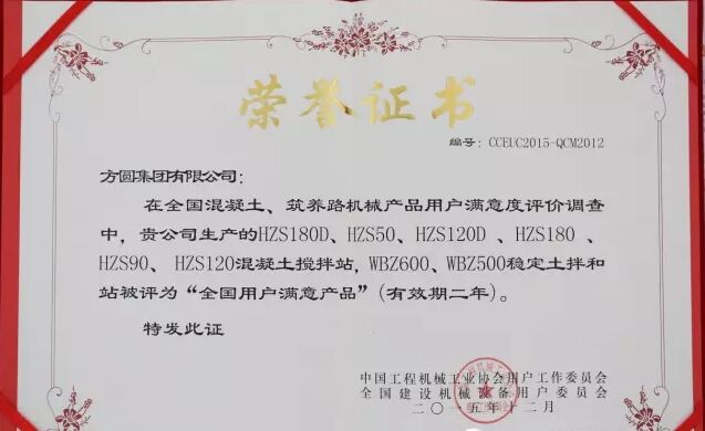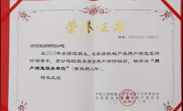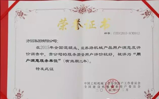 此外,因為方圓集團(tuán)在2015年度全國混凝土機(jī)械行業(yè)用戶滿意度評價調(diào)查中,受到廣大用戶的一致好評,被授予“全國混凝土機(jī)械用戶滿意十強企業(yè)”稱號。在產(chǎn)品質(zhì)量調(diào)查中,連續(xù)七次被評為“全國用戶滿意單位”。