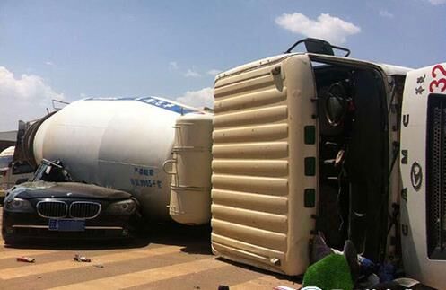 景明北路與陽春大道交叉口處有多條明顯的剎車痕跡,其中一條較寬疑似攪拌車的剎車痕跡長約二三十米。牌照為云ABXX20的攪拌車向右側翻后,駕駛室受損嚴重,玻璃脫落,車內(nèi)物品散落一地。倒下的罐體壓住了一輛黑色云A6XXVS牌照的寶馬740i轎車,轎車的整個左半邊幾乎被壓平,整車車胎全部爆裂,尤其是駕駛室被壓得最為嚴重,站在車外根本看不見內(nèi)部情況。有現(xiàn)場目擊者稱,當時攪拌車側翻壓到寶馬車之后,車子還往前硬生生推出了近30米。