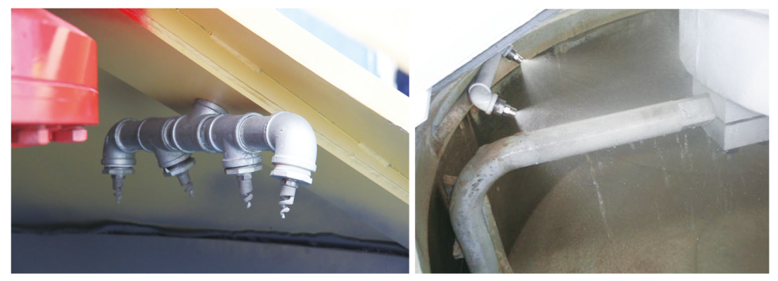 水路采用上置式結構(專利產品),解決管路中殘余外加劑和水的現(xiàn)象,避免可客戶換配方時造成損失。噴頭采用螺旋形實心圓錐形噴嘴,具有細密均勻的霧化效果,覆蓋面積大,使物料攪拌均勻。