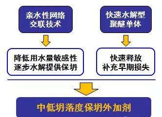 綜合來講,PCE減水劑在配制中低坍落度混凝土方面提供了有效技術保障。中低坍落度減水劑作用技術線路圖如下圖所示: