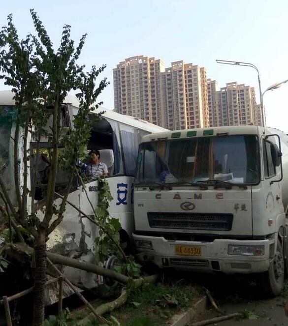 八月十七日,合肥市湖南路與南寧路附近,一輛攪拌車與運(yùn)送員工的班車相撞,造成至少20人受傷,2人傷勢(shì)較重。