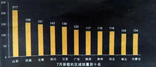 今年前7月,除2月份出口量不足800臺(tái),其它月份出口數(shù)量基本均在1000~1300臺(tái)的區(qū)間內(nèi)上下波動(dòng),相對(duì)比較平穩(wěn)。分區(qū)域來(lái)看,山東省繼續(xù)保持領(lǐng)先,7月份銷量達(dá)到217臺(tái),其余省份銷量均未達(dá)到200臺(tái),天津、上海、青海、海南、西藏等仍是銷量最少的省、市、自治區(qū)。
