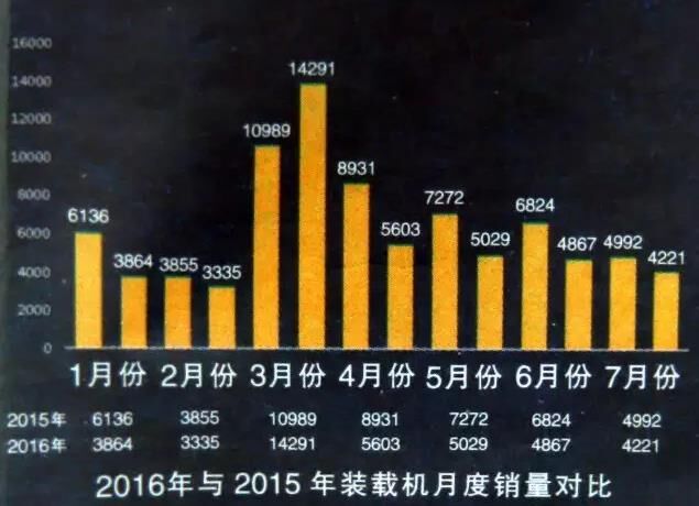 據(jù)公布的數(shù)據(jù),7月份全國(guó)26家主要裝載機(jī)生產(chǎn)企業(yè)共銷售各類裝載機(jī)4221臺(tái),同比2015年7月份的4992臺(tái),下降15.44%;環(huán)比6月份的4867臺(tái),下降13.27%。其中3噸及以上裝載機(jī)銷量為3796臺(tái),3噸以下小型裝載機(jī)銷量為425臺(tái)。從細(xì)分類型來(lái)看,3噸及5噸裝載機(jī)為主力銷售機(jī)型,合計(jì)銷量占比達(dá)到80%。綜合來(lái)看前7月銷量,除3月份曇花一現(xiàn)般同比大幅增長(zhǎng)30.05%外,其余月份裝載機(jī)銷量均在下滑。但一個(gè)積極的現(xiàn)象是,4月份以來(lái)裝載機(jī)雖持續(xù)下滑,但降幅一直在收窄,自4月份的37.26%收窄到7月份的15.44%。