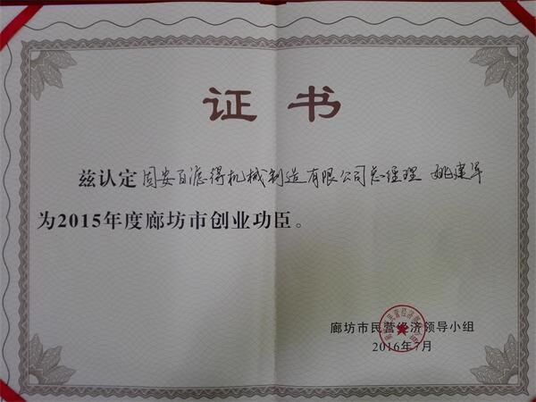近日,固安百濾得機(jī)械制造有限公司總經(jīng)理姚建軍榮獲廊坊市創(chuàng)業(yè)功臣獎(jiǎng),獎(jiǎng)金十萬元整,也正是如此,更加說明市場(chǎng)對(duì)百濾得的認(rèn)可,百濾得對(duì)市場(chǎng)的優(yōu)質(zhì)服務(wù)。
