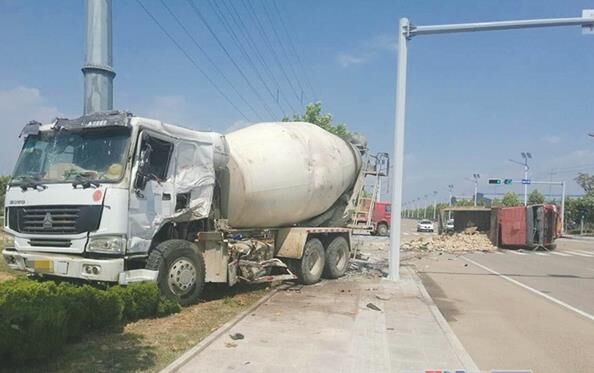 當(dāng)日,劉某駕駛混凝土攪拌車在南海新區(qū)沿著龍海路由北向南行駛,行至龍海路與海韻路交會(huì)處闖紅燈行駛,與沿海韻路由東向西正常行駛的大貨車發(fā)生碰撞,導(dǎo)致大貨車翻車,拉載的石塊散落一地?;炷翑嚢柢噭t沖進(jìn)了路邊綠化帶內(nèi),將兩棵行道樹和一根燈桿撞倒,路邊人行道上的部分石板被掀起。