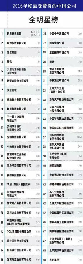 這份榜單一向被認(rèn)為是中國(guó)公司軟實(shí)力的晴雨表,今年的排行榜由《財(cái)富》(中文版)通過網(wǎng)絡(luò)向35000名中國(guó)企業(yè)管理人發(fā)放問卷調(diào)查得出。調(diào)查評(píng)分標(biāo)準(zhǔn)主要包括產(chǎn)品和服務(wù)地位、長(zhǎng)期投資價(jià)值、公司資產(chǎn)合理利用、創(chuàng)新能力、管理質(zhì)量、財(cái)務(wù)穩(wěn)健程度、吸引和保留人才的能力、社會(huì)責(zé)任、全球化經(jīng)營(yíng)的有效性9個(gè)方面,綜合得分最高的50家公司榮登“最受贊賞的中國(guó)公司”全明星榜。