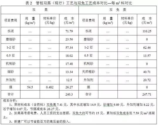 單單從混凝土原材料來看,“雙免”工藝比傳統(tǒng)“雙蒸”工藝高。如果考慮節(jié)省的燃料費(fèi)用和“雙蒸”工藝的電力費(fèi)用、人工工資支出差額,則“雙免”工藝比傳統(tǒng)“雙蒸”工藝可以節(jié)省成本7.59元/m3混凝土,而且完全滿足了環(huán)保要求。下表是成本分析對(duì)照表。
