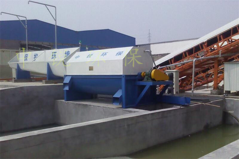 該系統(tǒng)主要由:攪拌車加水清洗裝置,溜槽輸送裝置,砂石漿水分離裝置,和泥漿水后處理裝置組成。混凝土輸送設(shè)備清洗后,將殘余混凝土排入溜槽中,在高壓水流沖擊下,經(jīng)溜槽進(jìn)入砂石分離機(jī),在不斷旋轉(zhuǎn)的分離機(jī)作用下,對混凝土進(jìn)行充分的清洗,同時(shí)將砂、石進(jìn)行分離,分離后的砂、石在導(dǎo)料葉片的作用下背向流動,再通過提升式出料口排出分離機(jī),分別堆放。清洗后的漿水從分離機(jī)的底部排出進(jìn)入沉淀池逐級沉淀后循環(huán)使用或進(jìn)入攪拌池回收利用。進(jìn)入攪拌池(一般情況2個(gè)攪拌池)的漿水為了防止沉淀凝固,需通過攪拌器的作用,攪拌器的工作為間歇式。分離出水泥漿在連續(xù)的攪拌器作用下,再通過高壓污水泵輸送到攪拌樓中待生產(chǎn)計(jì)量再利用。整個(gè)控制系統(tǒng)設(shè)有手動和自動控制,方便控制設(shè)置,整個(gè)系統(tǒng)運(yùn)行可靠,故障率低,維護(hù)量少等特點(diǎn)。