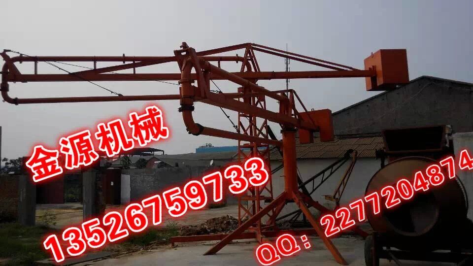 河南金源布料機(jī)桿采用回轉(zhuǎn),臂架式布料結(jié)構(gòu),配用125MM輸送管,360度回轉(zhuǎn),整機(jī)手動(dòng)操作。具有結(jié)構(gòu)簡(jiǎn)單,強(qiáng)度、剛性可靠,操作簡(jiǎn)單,靈活,維修方便等特點(diǎn),與混凝土泵配套使用可廣泛的應(yīng)用于民用與工業(yè)建筑的混凝土澆注工程中