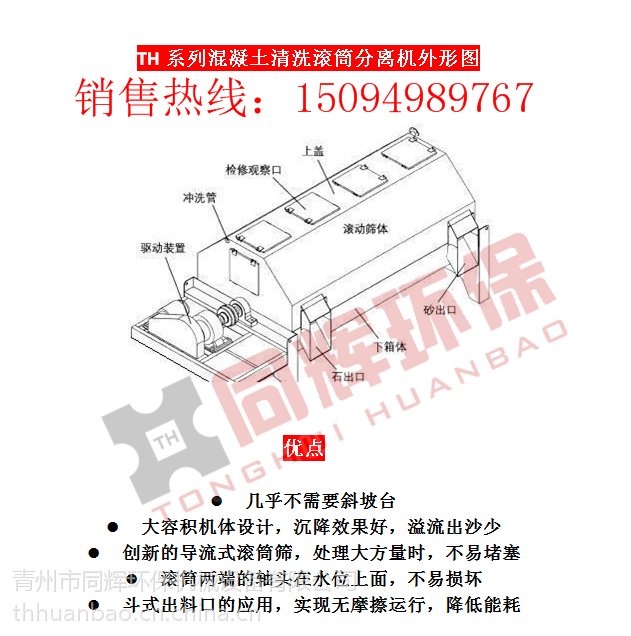 該裝置機械結(jié)構(gòu)簡單,環(huán)保效益顯著:分離出砂石表面光潔,砂子含灰≤1%,含水≤3-5%;洗車水循環(huán)使用,污水達(dá)到零的排放;設(shè)備耐磨,操作簡單,便于清理檢修。