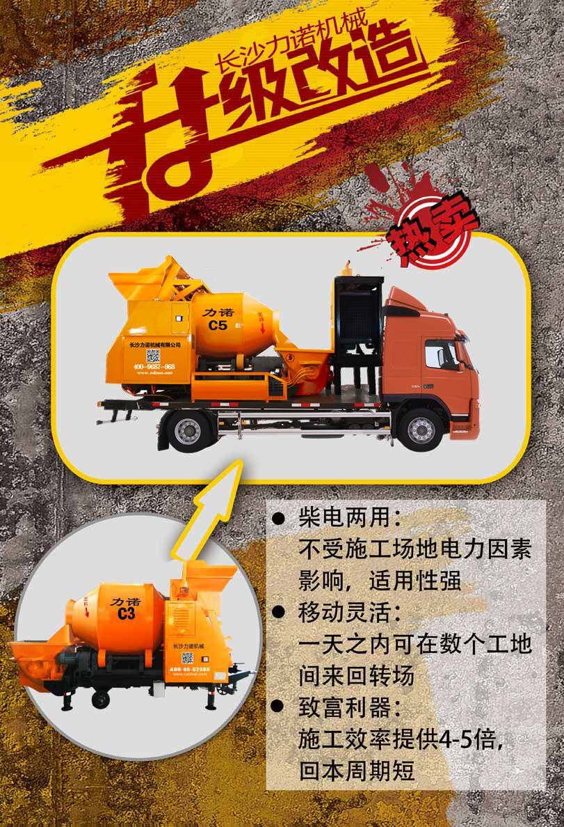 柴電兩用不受場地電量影響。操作簡單,一人操作整機(jī),解決雇人難,降低勞動(dòng)強(qiáng)度,讓混凝土更高,更遠(yuǎn),更安全的輸送。增加汽車底盤,轉(zhuǎn)場更方便,維修更簡單。