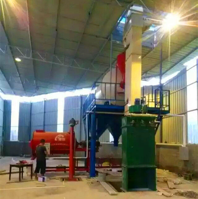 二次攪拌:?;⒅榛蛘哒渲閹r與預(yù)混合好的干粉物料按配方比例添加至斗式提升機(jī)喂料口,經(jīng)斗提提升至滾筒式攪拌機(jī)內(nèi),隨著攪拌鼓的旋轉(zhuǎn),鼓內(nèi)的葉片把混合料提升到一定的高度,然后靠自重自由撒落下來(lái)。這樣周而復(fù)始地進(jìn)行,直至拌勻?yàn)橹??;⒅榛蛘渲閹r幾乎零破碎。在靠滾筒出料口位置內(nèi)部焊接有近似于螺旋狀的導(dǎo)流鋼板,正轉(zhuǎn)時(shí)不但不會(huì)將拌料轉(zhuǎn)出進(jìn)料口,反而達(dá)到攪拌作業(yè),反轉(zhuǎn)時(shí),由于導(dǎo)流片焊接于緊靠出料口,拌料自然卸出.殘留物料小于1%。