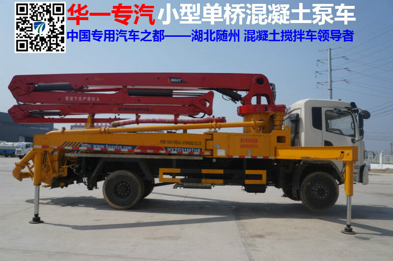 湖北華一專用汽車有限公司生產(chǎn)的小型泵車是國(guó)內(nèi)首創(chuàng)小型混凝土臂架泵車,是目前國(guó)內(nèi)體積小、一車兩用(高壓車載泵送、低壓泵送臂架布料)最具創(chuàng)意和經(jīng)濟(jì)效益的臂架泵車,以機(jī)械化作業(yè),代替勞動(dòng)力(能替代40多個(gè)勞動(dòng)力),填充農(nóng)、鄉(xiāng)、城、鎮(zhèn)建筑混凝土輸送的空白,適用于國(guó)家政策城鄉(xiāng)一體化建設(shè)不可缺少的專用車輛、具有靈活、方便、高效、經(jīng)濟(jì)、智能的優(yōu)點(diǎn),小型混凝土臂架泵車在湖北具有代表性。